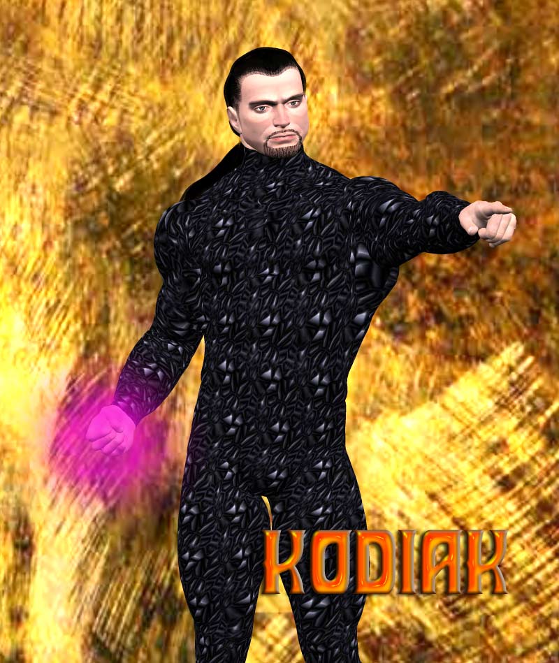 Real Name: Kody Blake Background: Kodiak is an artificial life form created by the Clone Master as the ultimate warrior. He escaped his creator, however, and fled to Canada, living in the wilds for a time. He eventually drifted to the United States. Active for years in New York City in partnership with Overcoat, he was kidnapped by Clone Master during the alien invasion known as the Hero Wars. Rescued by Watchstar, he joined the team and was a founding member of Watchstar West, which eventually became Knight/Watch. Kodiak has also been a frequent partner of Rebel. He was married to Jade and the two have a child together named Dakota. Kodiak has a clone brother known as Blood and a genetic cousin known as Feral. He recently returned to New York, his old home, to re-open his bar, the Bear's Den, which was originally destroyed by Brimstone some time ago. Group Affiliation:: Former member of Watchstar, former member of Knight/Watch Status: Active Powers: Kodiak has superhuman strength and toughness. He can also summon energy into his hands for use as a weapon. Skills: Kodiak is an extremely skilled hand-to-hand fighter and has vast experience as an adventurer and hero. As a bartender, he can also mix a mean margarita. Technology: Kodiak's bodysuit is a living symbiote made by Clone Master. It provides Kodiak extra protection and helps regulate his metabolism. Creator: Jim LoPiano |
