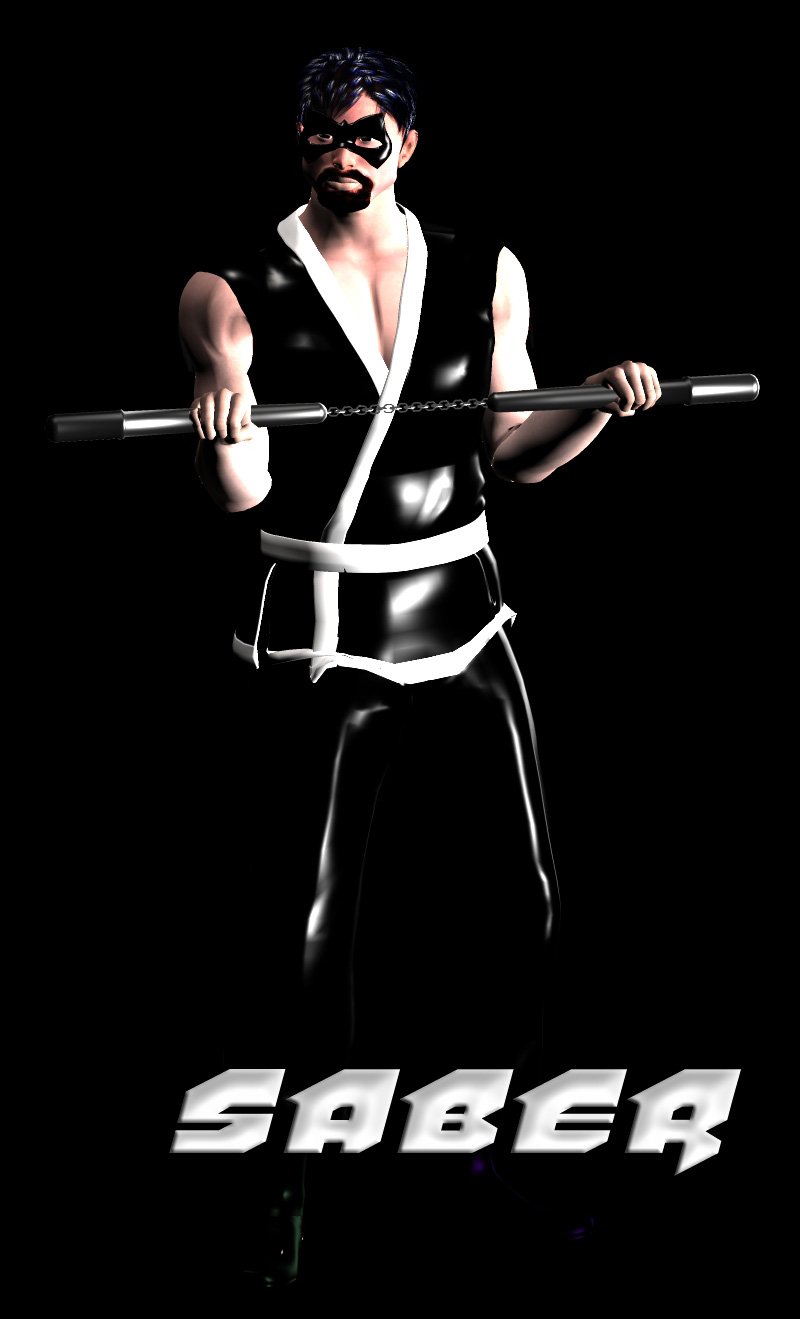 Real Name: Kim Su Background: Kim Su's family were masters of the ancient Korean martial art of Karaju. Sent on a mission to Pacific City by the monks of Karaju, by day he would work in his uncle's restaurant, and by night he would battle crime as Saber. He eventually became the partner of Cybercaptain. Status: Active Powers: Saber possesses all the powers of a Sinanju master, including the ability to project energy from his fingers and to paralyze with a single touch. Skills: Saber is an extremely skilled martial artist who trains obsessively. Technology: Saber favors a nunchaku, a gift from his grandfather. Creator: Jim LoPiano |