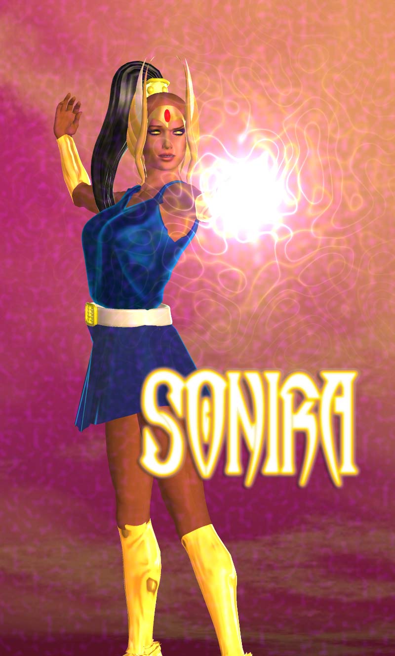 Real Name: Sonira, Chieftainess of the Tribes of Varanya Background: Sonira was a princess of a lost world deep beneath the Earth's surface. Watchstar encountered her early in the team's history. Curious about the surface world, she joined the team when they returned home and stayed on as a member of Watchstar. She later returned to her homeland in the company of Tyger. Group Affiliation:: Watchstar I Status: Unknown Powers: Like all her people, Sonira was a powerful telekinetic and capable of projecting and redirecting energy. Skills: Sonira was a trained combatant and expert hunter. Creator: Jeff Messina |