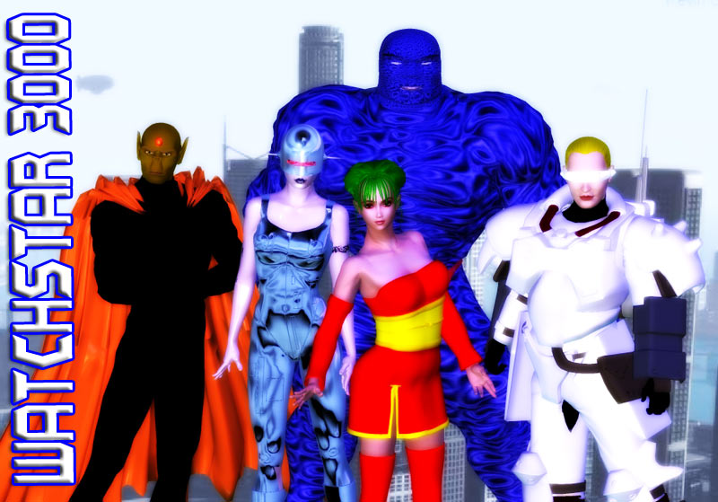 Watchstar 3000In the year 3000, the Age of Galactic Peace has been shattered with the conquest of Earth by the Saurial race. A group of freedom fighters have banded together to free Earth from the Saurial yoke and return the ideals of justice to the troubled galaxy. Protector (Colonel Carter Smith) was a commander in the Earthforce who uncovered an ancient trove of computer records left by his distant descendant, Jason Smith. The records inspired him to form a new Watchstar a thousand years after the first one. He is the team's leader and the chief planner in the Resistance. A modern suit of battle armor, bioware implants, and his Earthforce commando training, gives him superhuman abilities. Ventura (Sabina Maki) was a famous zero-g dancer and the great-granddaughter of John Mackey, the original Viceroy. Her bloodline's human genes have been enhanced by fusion with Karnak-enhanced DNA, giving her superhuman strength, speed, and flight. As a superhuman, she was one of the first hunted down by the Saurials, and her family were all killed. Vox (Valentine-567 O'Xian) was an exploratory cyborg working in high-radiation zones. Her orbital habitat was plunged into the sun by a Saurial attack, killing thousands of her fellow cyborgs. She has reprogrammed herself for revenge. Vox's cyberware includes sensor webs, integral weaponry, and computer controls. Warlock (Ao Durgan) is a shapeshifter and psychic whose people have been enslaved by the Saurials for millenia. Basalt (Bas Ult) was a slave in the Saurial gladiator pits, who led a slave uprising and broke free. He is seemingly impervious to harm and possesses phenomenal strength, based on his people's ability to control gravity. |