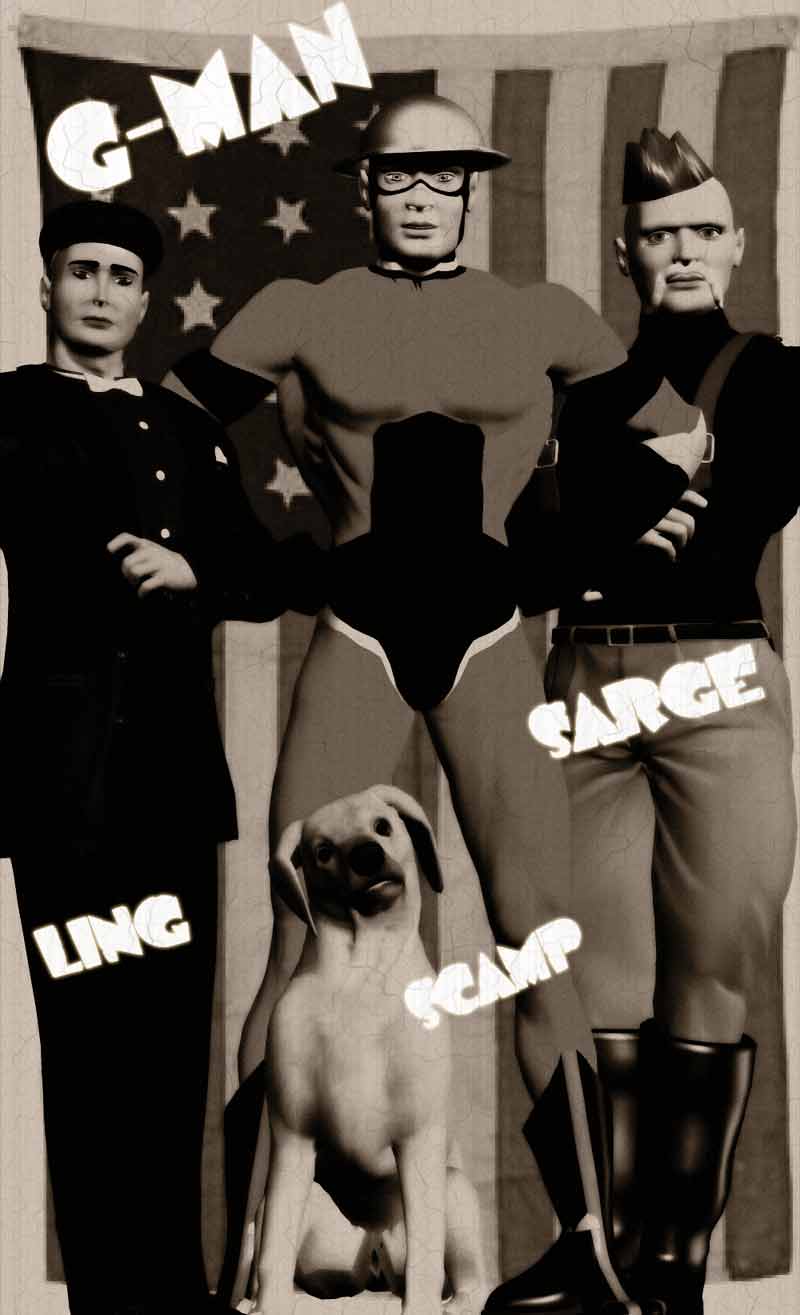 G-ManReal Name: Jack Jefferson Background: Jack Jefferson, a Midwestern barnstorming pilot, passed through a strange cloud over Kansas and was struck by a green lightning bolt. As a result, he was given super strength and toughness. Scientists attributed his powers to the way his muscles reacted against Earth's gravity, giving him the name G-Man. He served his country honorably in the Great War, battling the threat of Death's-Head time and again. Years later, he served as an inspiration to heroes of the Second World War, such as the Victory Squadron. Status: Deceased Powers: G-Man had superior strength and toughness. Skills: G-Man was a skilled combatant. He was also an expert biplane pilot. Technology: G-Man loved to use handguns. Sidekicks: G-Man was aided in his exploits by three sidekicks. Sarge (Robert Bruce McTavish) was an army sergeant who was G-Man's companion throughout the Great War and beyond. Ling (Ling Po) was G-Man's driver, a skilled martial artist and, of course, laundryman. Scamp was a mongrel dog rescued from a French battlefield who proved to be extremely intelligent and brave under fire. Creator: Ed Messina |